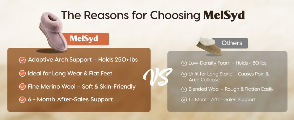 1、Arch Support Masterpiece: Sheepskin Slippers for women/men are designed with strategic arch support, providing relief and comfort for those with foot pain, plantar fasciitis, flat feet, or anyone seeking extra cushioning underfoot, MelSyd is the first to implement it
