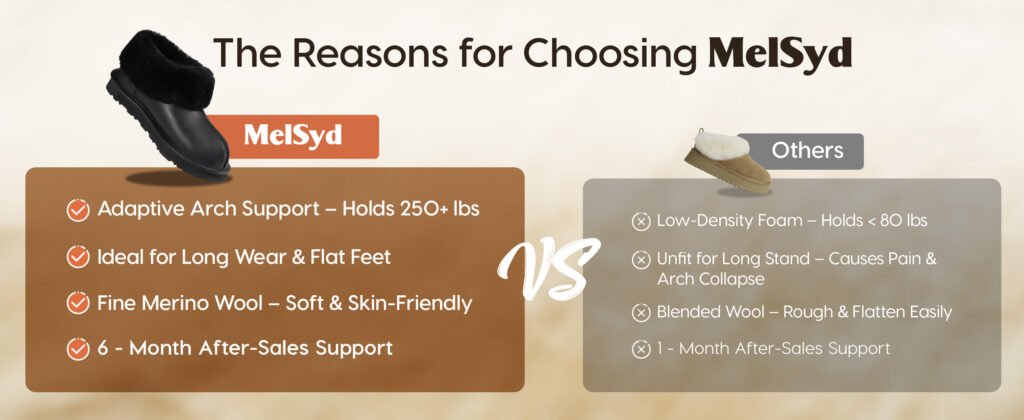 1、Arch Support Masterpiece: Sheepskin Slippers for women/men are designed with strategic arch support, providing relief and comfort for those with foot pain, plantar fasciitis, flat feet, or anyone seeking extra cushioning underfoot, MelSyd is the first to implement it