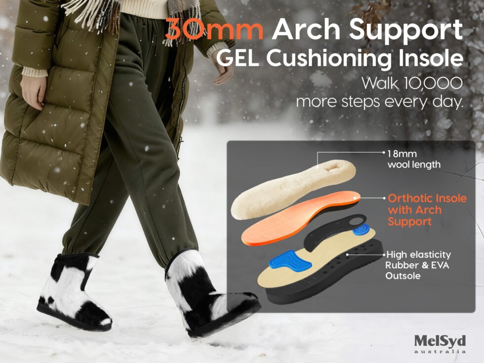 2、Arch Support Masterpiece: These knee high sheepskin boots for women are designed with strategic arch support, providing relief and comfort for those with foot pain, plantar fasciitis, flat feet, or anyone seeking extra cushioning underfoot, MelSyd is the first to implement it