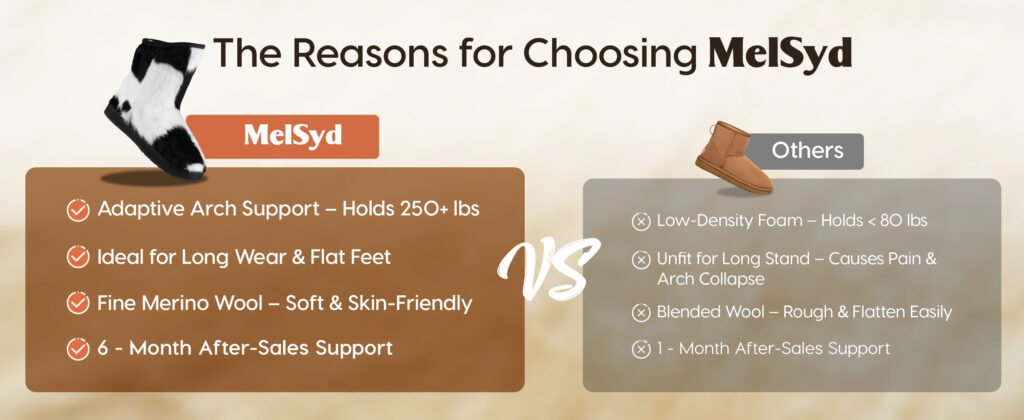 2、Arch Support Masterpiece: These knee high sheepskin boots for women are designed with strategic arch support, providing relief and comfort for those with foot pain, plantar fasciitis, flat feet, or anyone seeking extra cushioning underfoot, MelSyd is the first to implement it