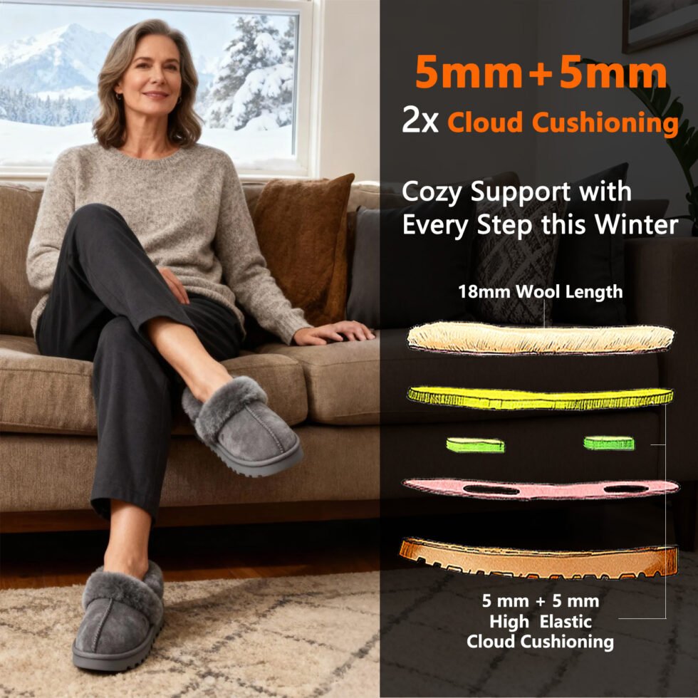 3、Dual-Layer Memory Foam + Wool Support‌:This Women House shoes designed use 5mm+5mm high resilient memory foam delivers cloud-like cushioning, paired with18mm Australian Shearling lining provides natural support—Reducing fatigue ensuring all-day comfort